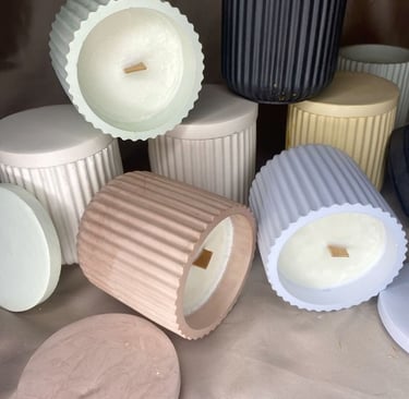 Our hand-poured, eco-friendly candles are designed to create a calming, elegant atmosphere. Each candle is housed in a beautifully crafted gypsum clay jar, offering both sophistication and sustainability. These jars are reusable, making them a perfect blend of luxury and eco-conscious living.